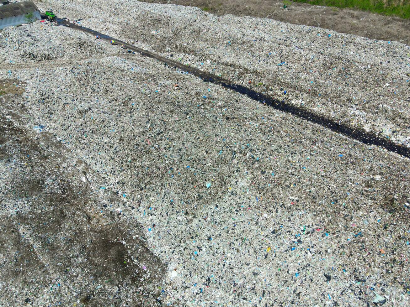 Aerial view landfill garbage waste huge dump environmental pollution problem, Top view on plastic and other industrial waste ecological disaster from above with garbage sorting garbage disposal photo