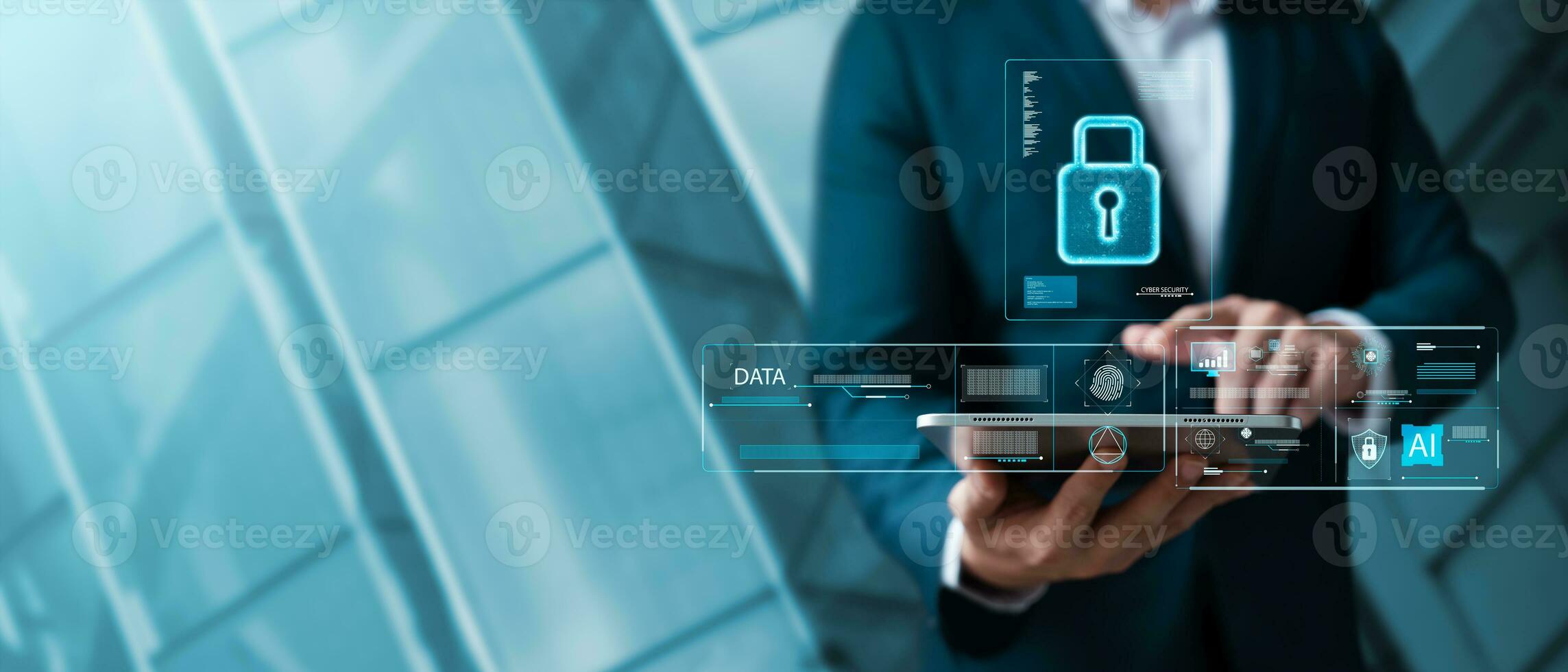 Cyber security and data protection, businessman use secure tablet encryption technology, protect business and financial transaction data from cyber attacks, intelligent protection digital attacks. Pro Photo
