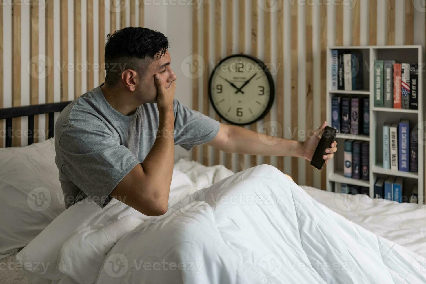 Lazy man oversleep, wake up late, hit the alarm clock frequently with madness. Modern lifestyles often require people to work hard and put in overtime, which can result in not getting enough sleep. Pro Photo