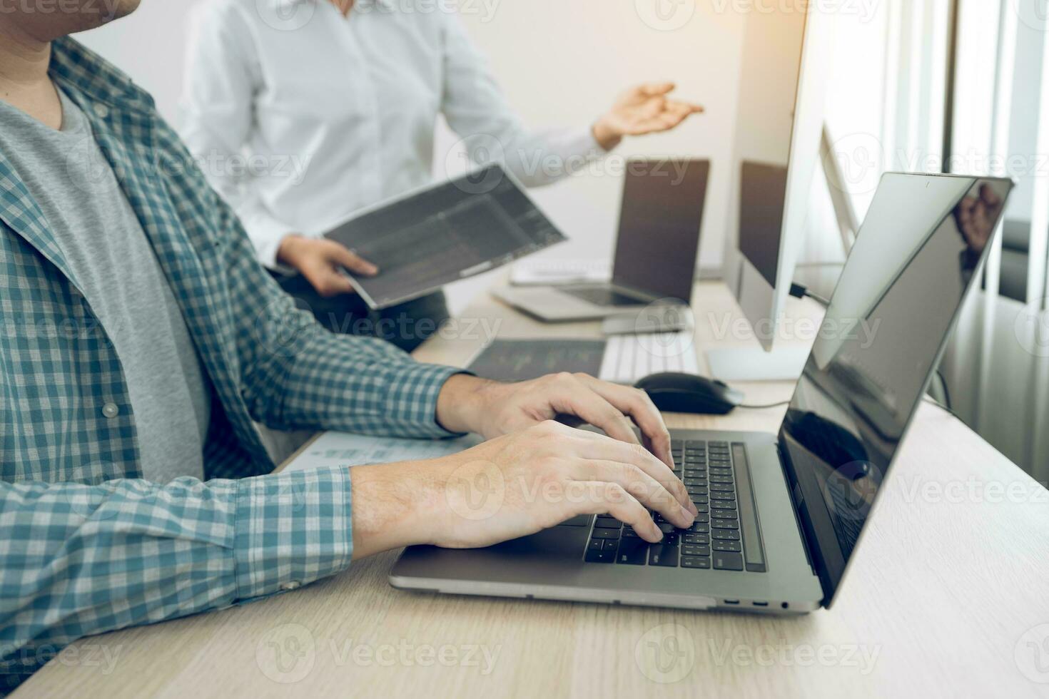Two partnerships developing programming and coding technologies working on laptop and analyzing together. Pro Photo