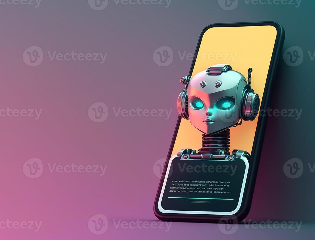 Futuristic robot in screen of smartphone. Concept of chatbot with artificial intelligence. Pro Photo