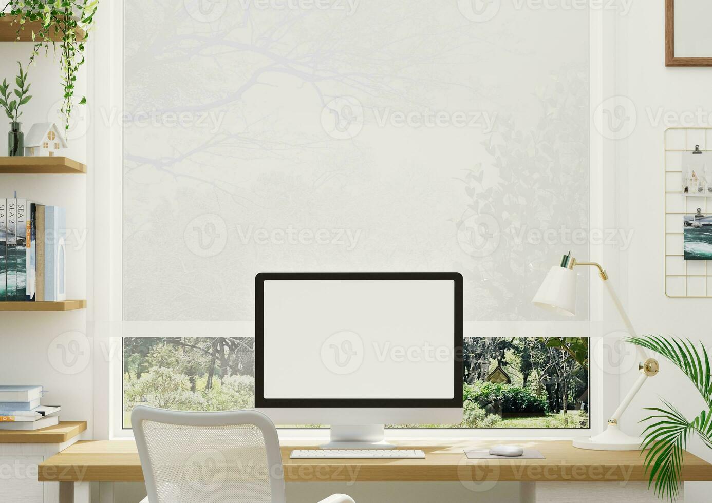 Mockup desktop computer In the warm office at home, there was light coming through the window. with clipping path. 3d rendering Pro Photo