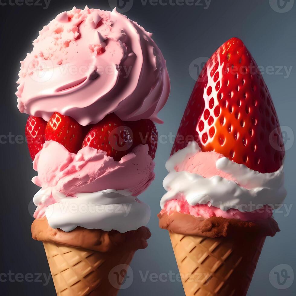 3D Rendering Realistic Strawberry And Vanilla Ice-Cream Cone With Fresh Strawberries. Pro Photo