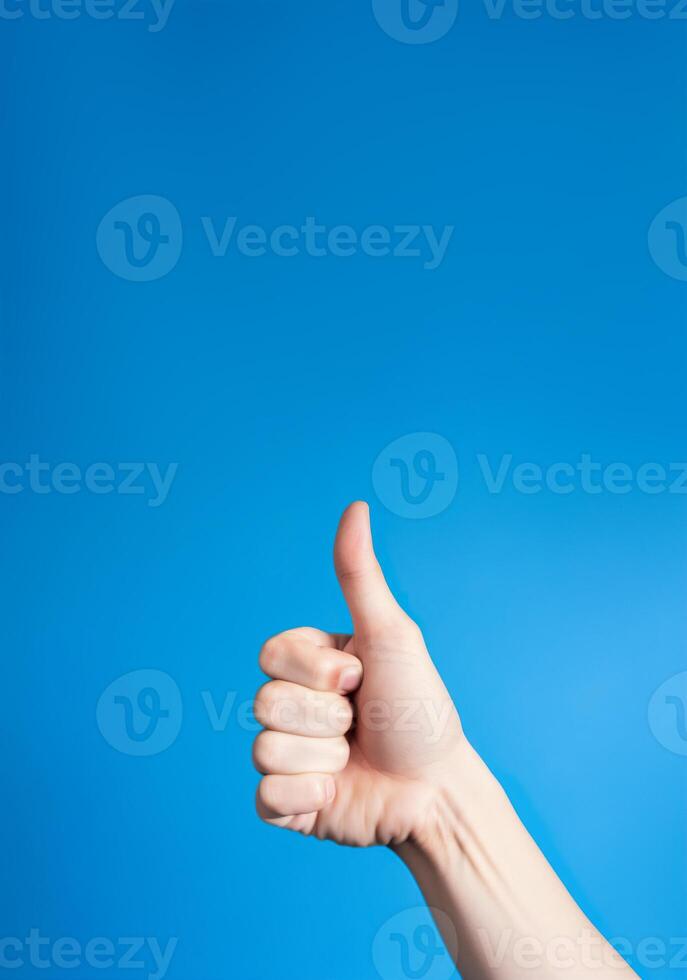 Realistic thumb up hand gesture on blue background with copy space. Like. Good feedback, positive reaction. Validation and approval. Empty space for text. . Pro Photo