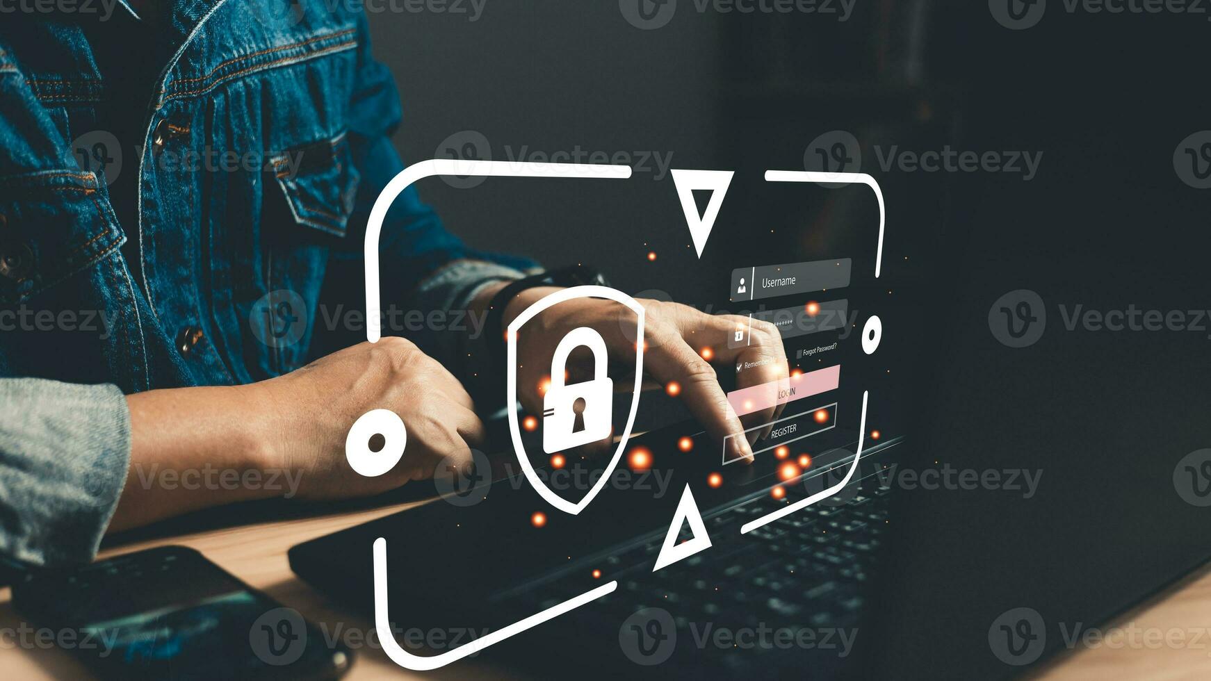 Businessman protecting personal data on smart phone and laptop with virtual screen interfaces.Cybersecurity and privacy concepts to protect data. Lock icon and internet network security technology. Pro Photo