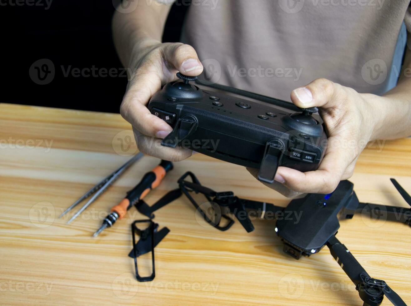 Professional mechanic repairing a drone, setting it up, on a table with various tools. in modern workshop Pro Photo