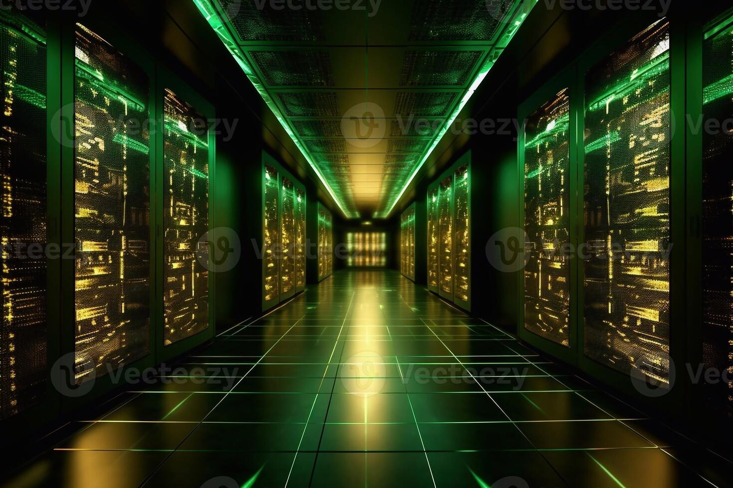 Dark servers data center room with storage systems and digital graphs and charts 3D rendering Pro Photo