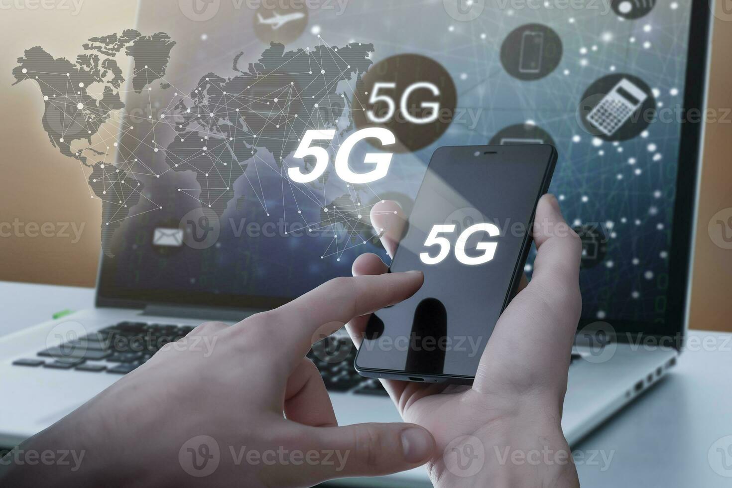 5G High speed internet network communication, man using mobile smartphone with 5G icons flow on virtual screen, worldwide connection Pro Photo