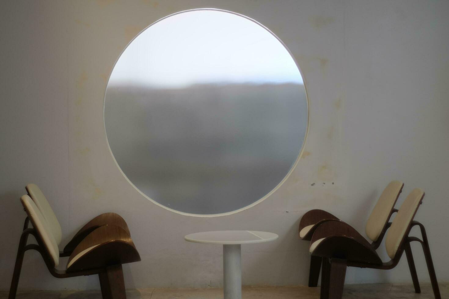 a round window with a chair and table in front of it photo