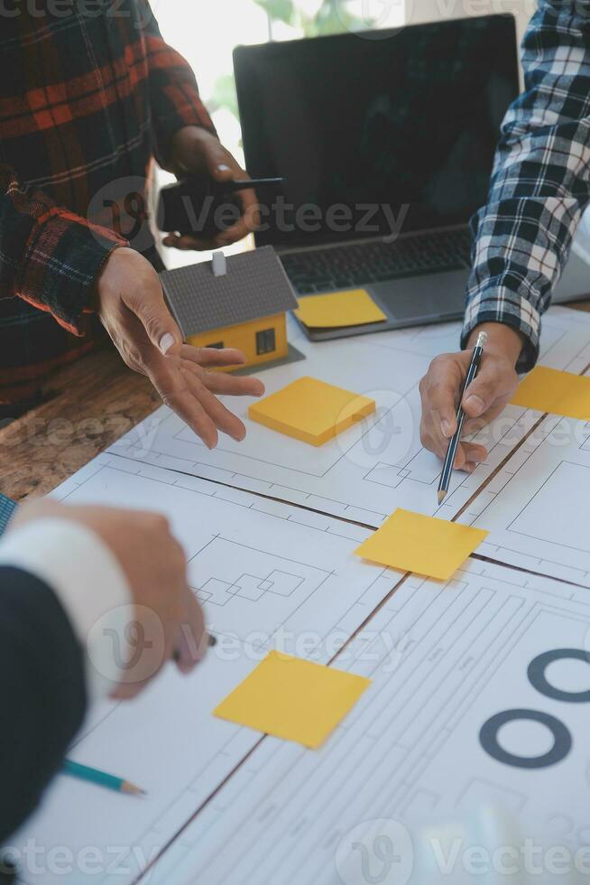 Engineer Teamwork Meeting, Drawing working on blueprint meeting for project working with partner on model building and engineering tools in working site, Construction and structure concept. Pro Photo