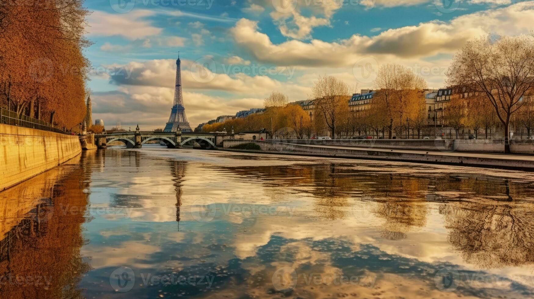 a beautiful scene of the Eiffel Tower gracefully reflected in the water of a river. The iconic tower appears to be in the background, with its elegant structure standing tall against the cloudy sky. Pro Photo