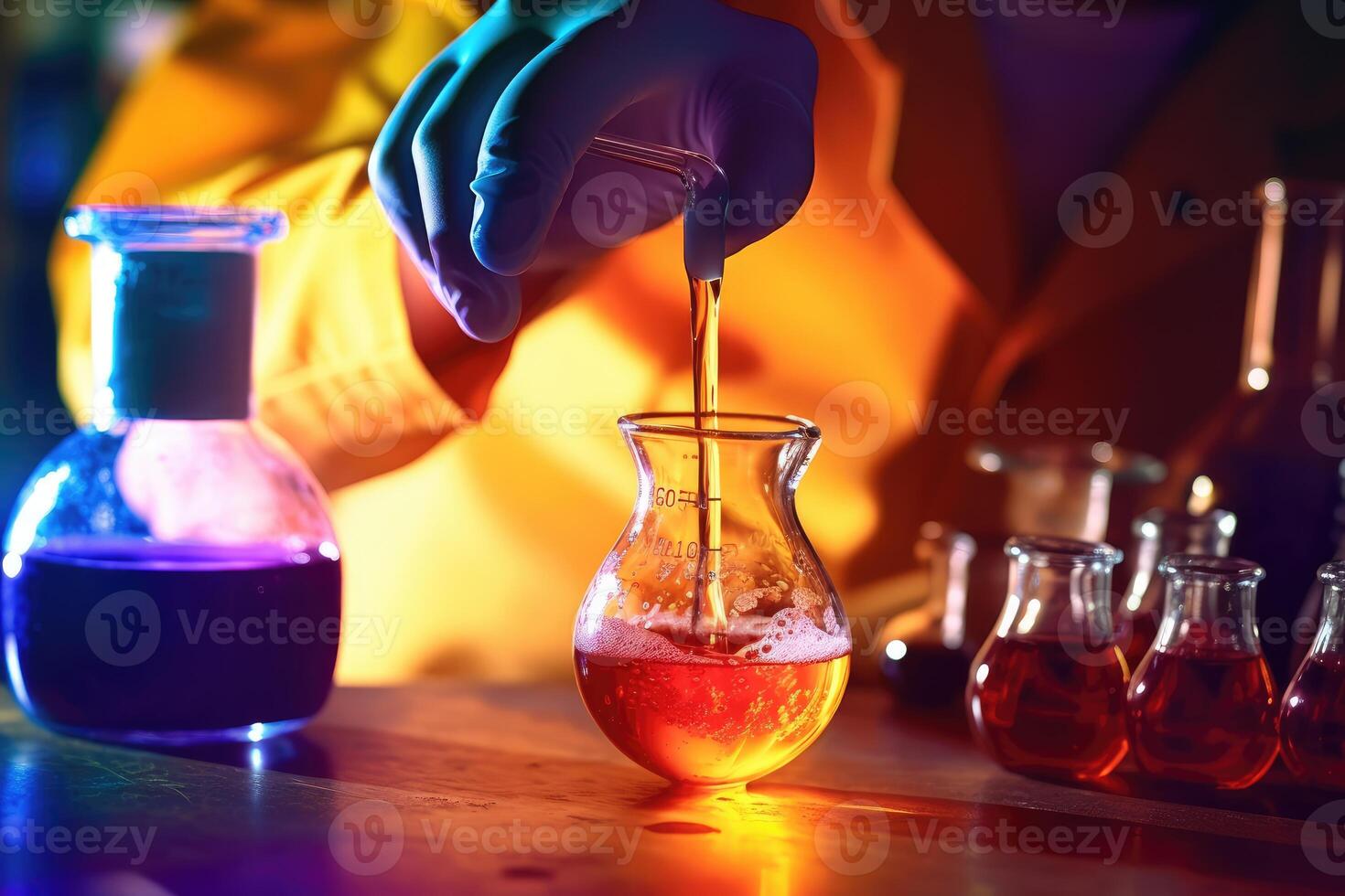 A close - up photo of a scientist's hand, clad in a lab coat and gloves, gripping a flask containing a chemical solution. Pro Photo