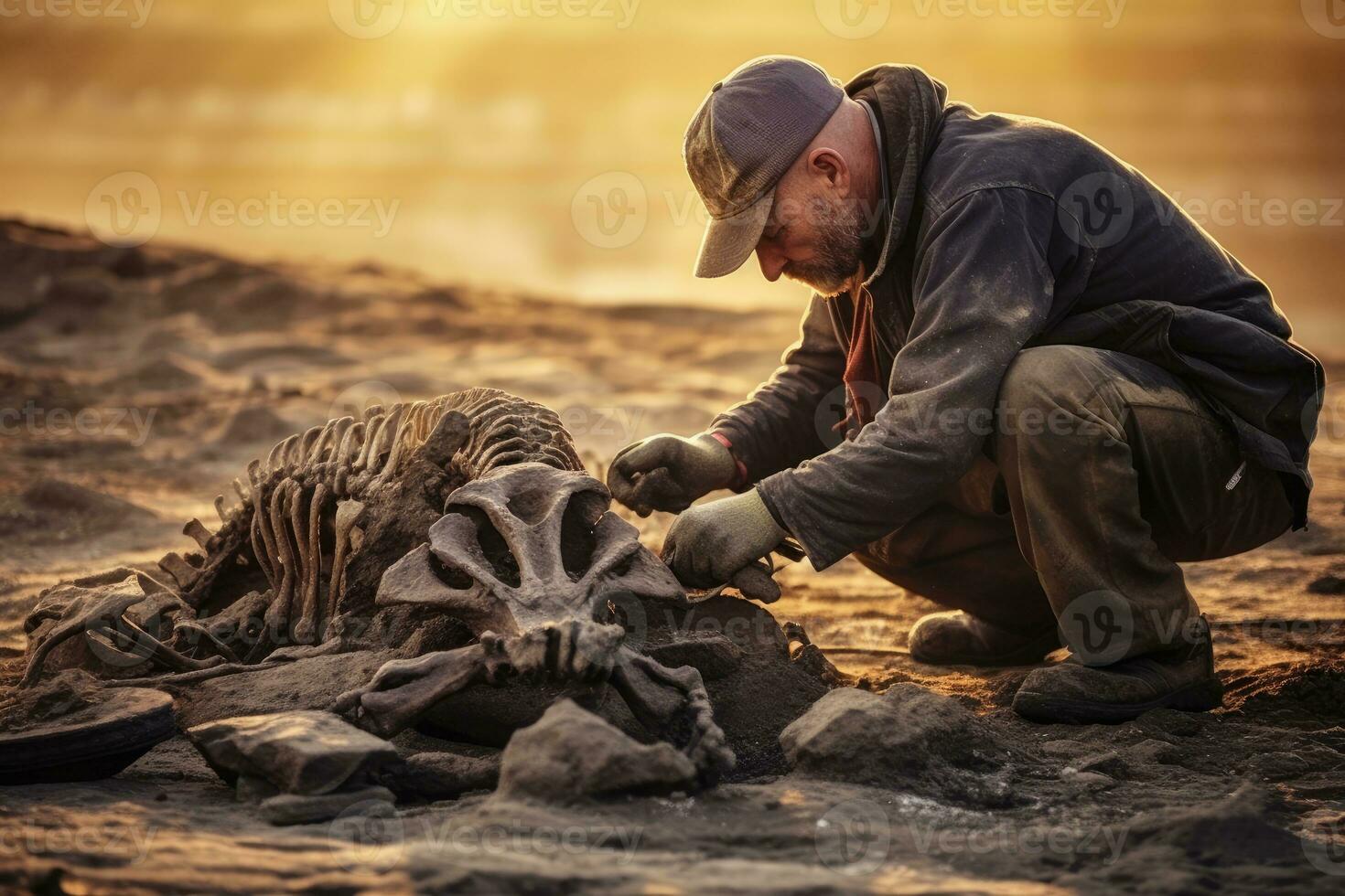 At a remote archaeological dig, a scientist uncovers the fossilized remains of a prehistoric creature. Generative AI Pro Photo