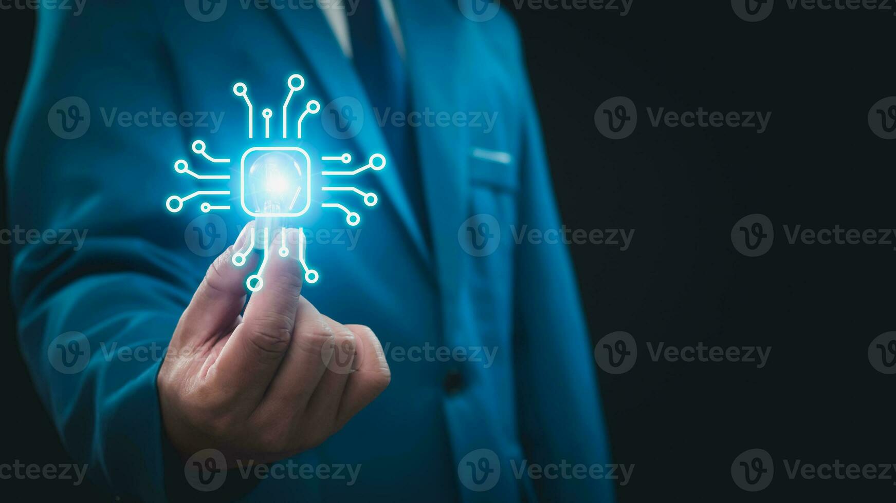 Businessman holding light bulb with robot circuit board model and AI, symbol, machine learning, artificial intelligence of future technology, AI network of brains in business analytics. Pro Photo