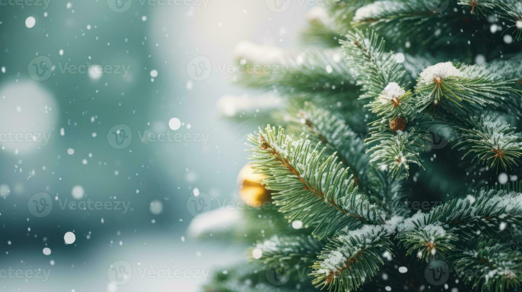 Close-Up of Christmas Tree Garland Greenery with Blurred Background, Bokeh, and Falling Snow. AI Generated Pro Photo