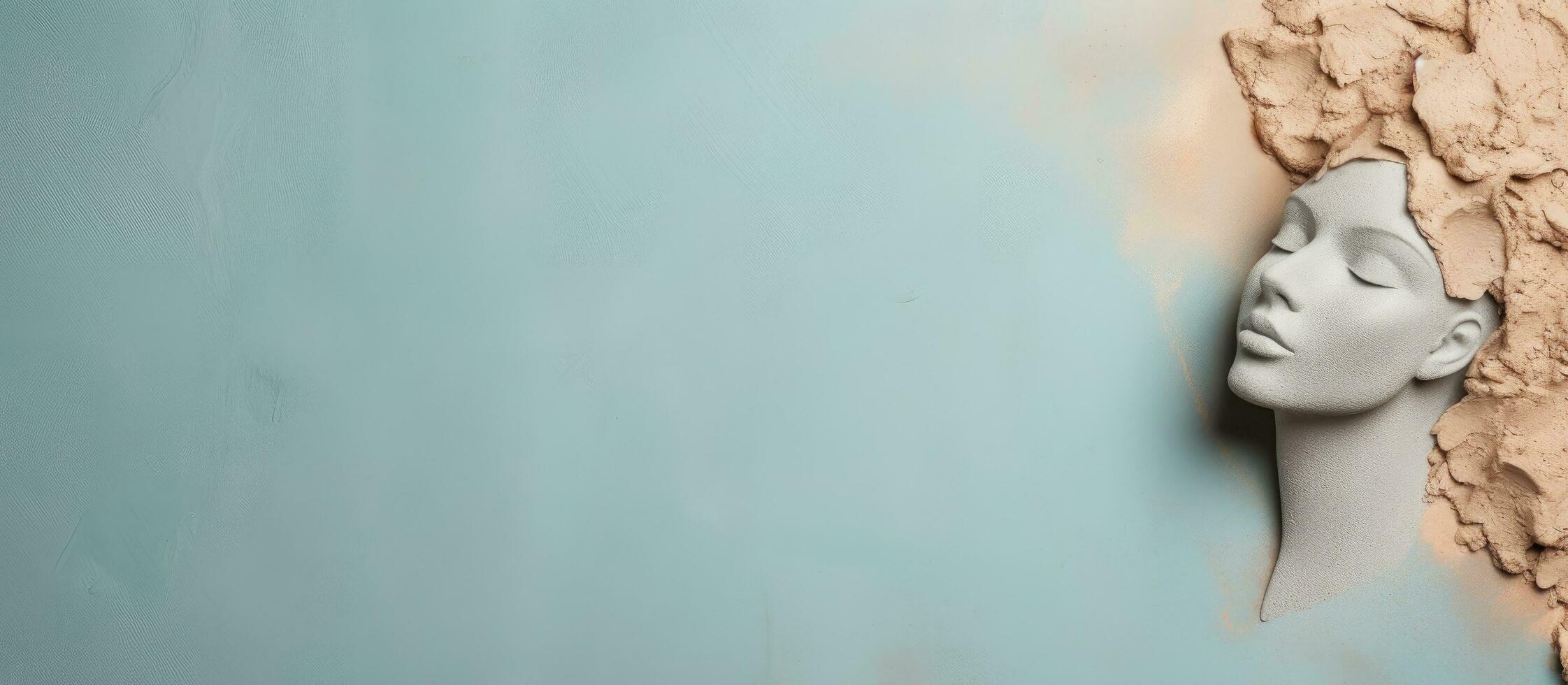 Photo of a mysterious white head emerging from a wall, creating a surreal and intriguing image with copy space