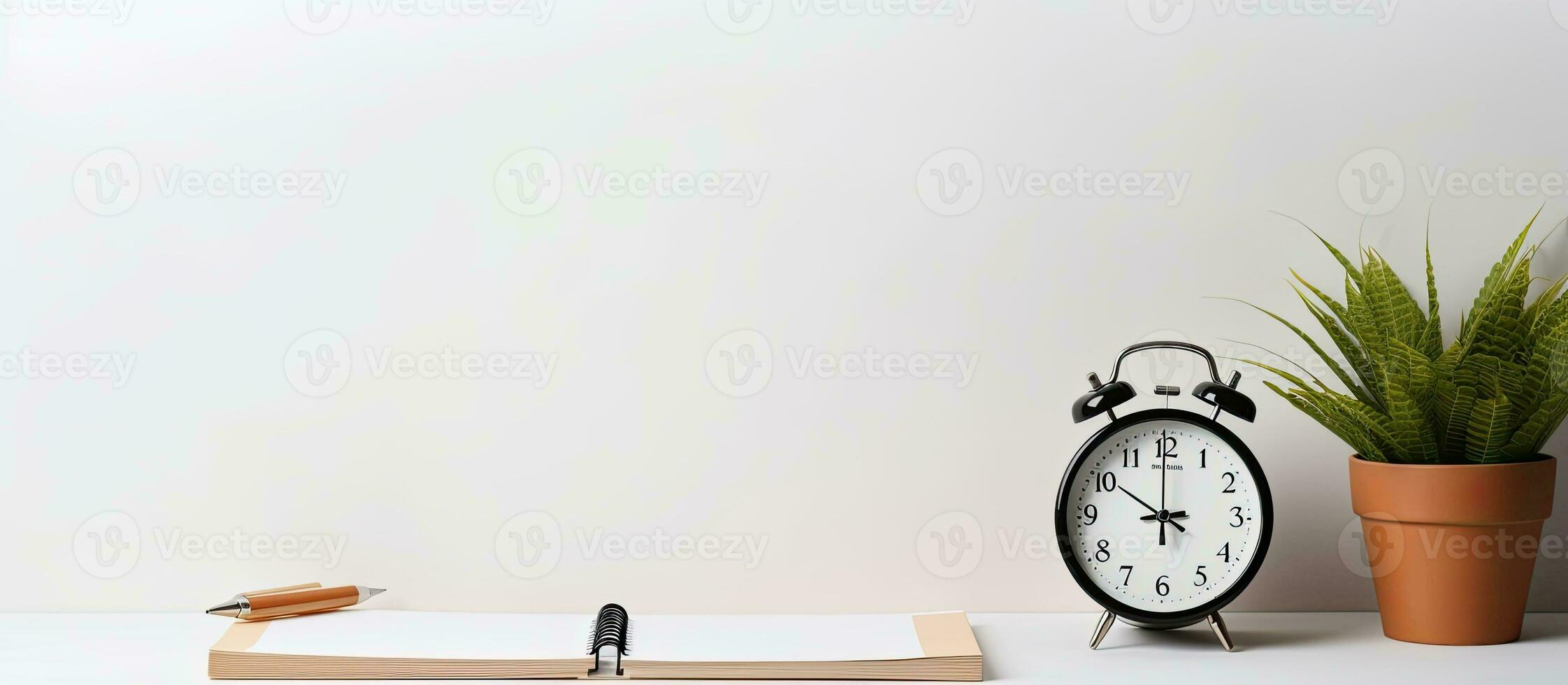 Photo of an alarm clock and pen on a desk, with plenty of space for your own notes and reminders with copy space Pro Photo