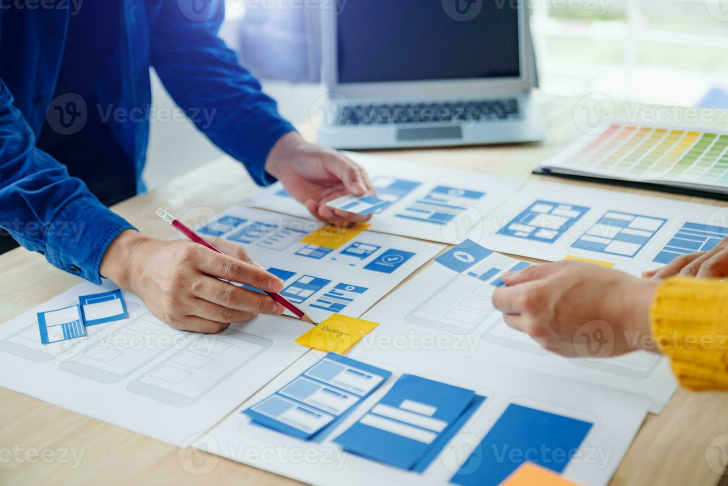View of UI developer team brainstorming on their project with laptop, smartphone and digital tablet. Creative digital development agency. Pro Photo