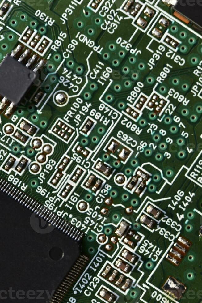Blue board with radio elements. A chip with a processor and transistors. Diodes and resistors. Microchip. Pro Photo
