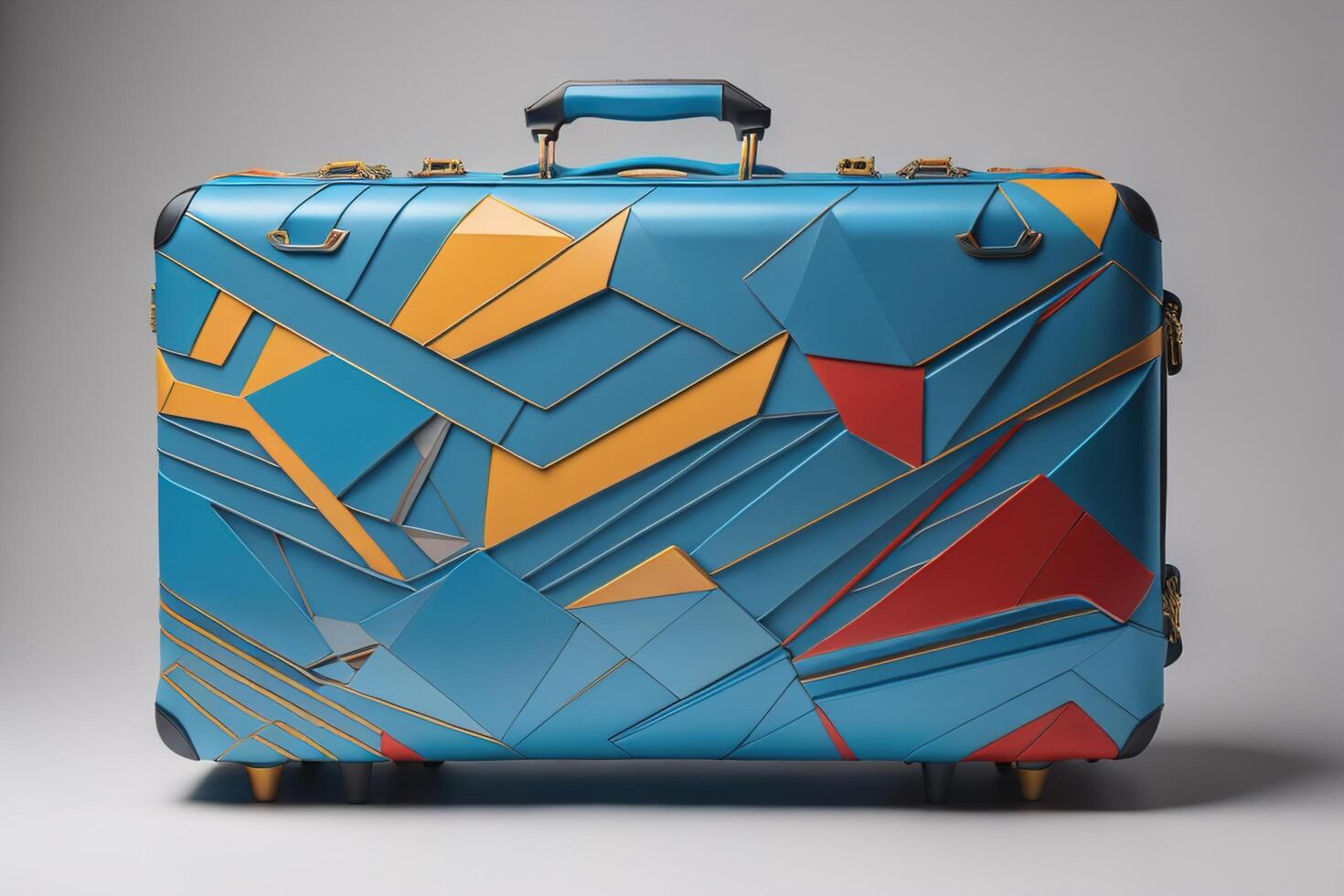 A blue suitcase with a pattern of geometric shapes. Free Photo