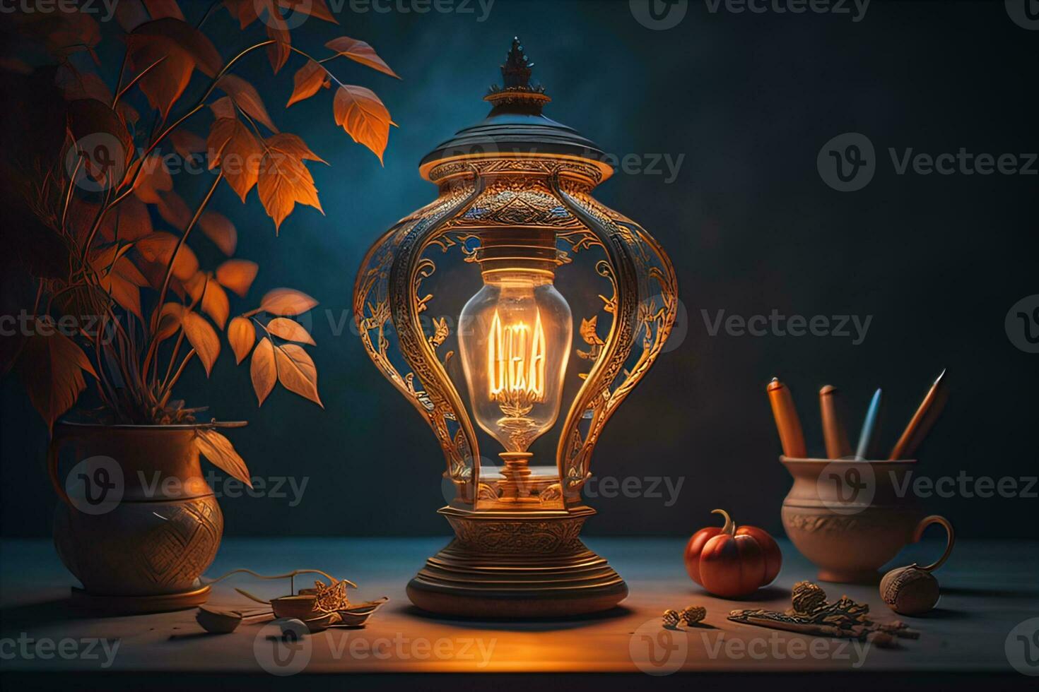 Lantern with glowing light on dark background. ai generative Pro Photo