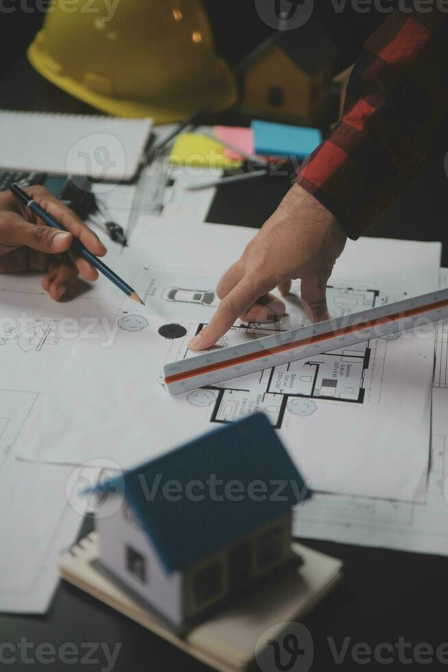Engineer Teamwork Meeting, Drawing working on blueprint meeting for project working with partner on model building and engineering tools in working site, Construction and structure concept. Pro Photo