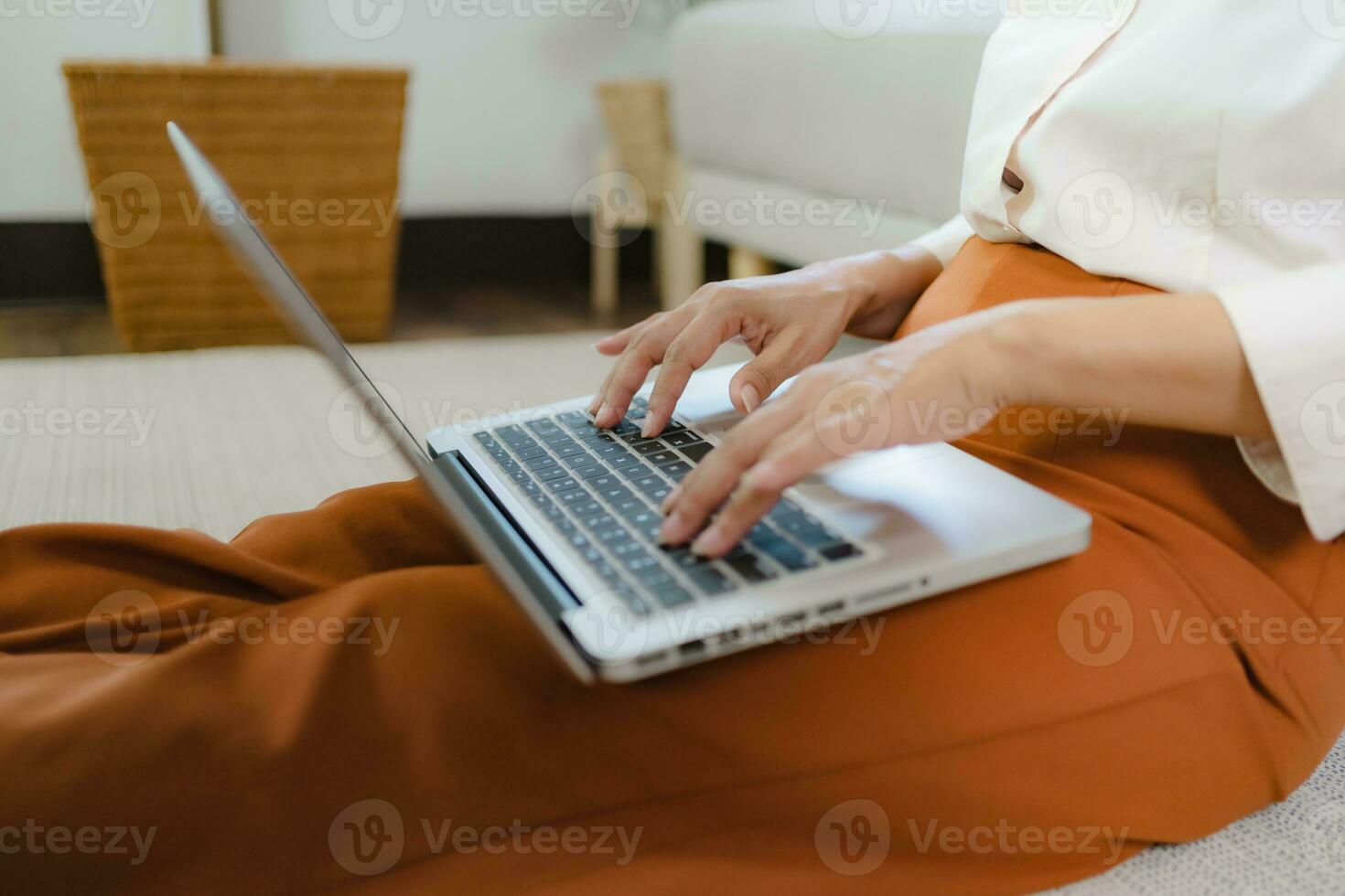 Working by using a laptop computer on wooden table. Hands typing on a keyboard.technology e-commerce concept Pro Photo