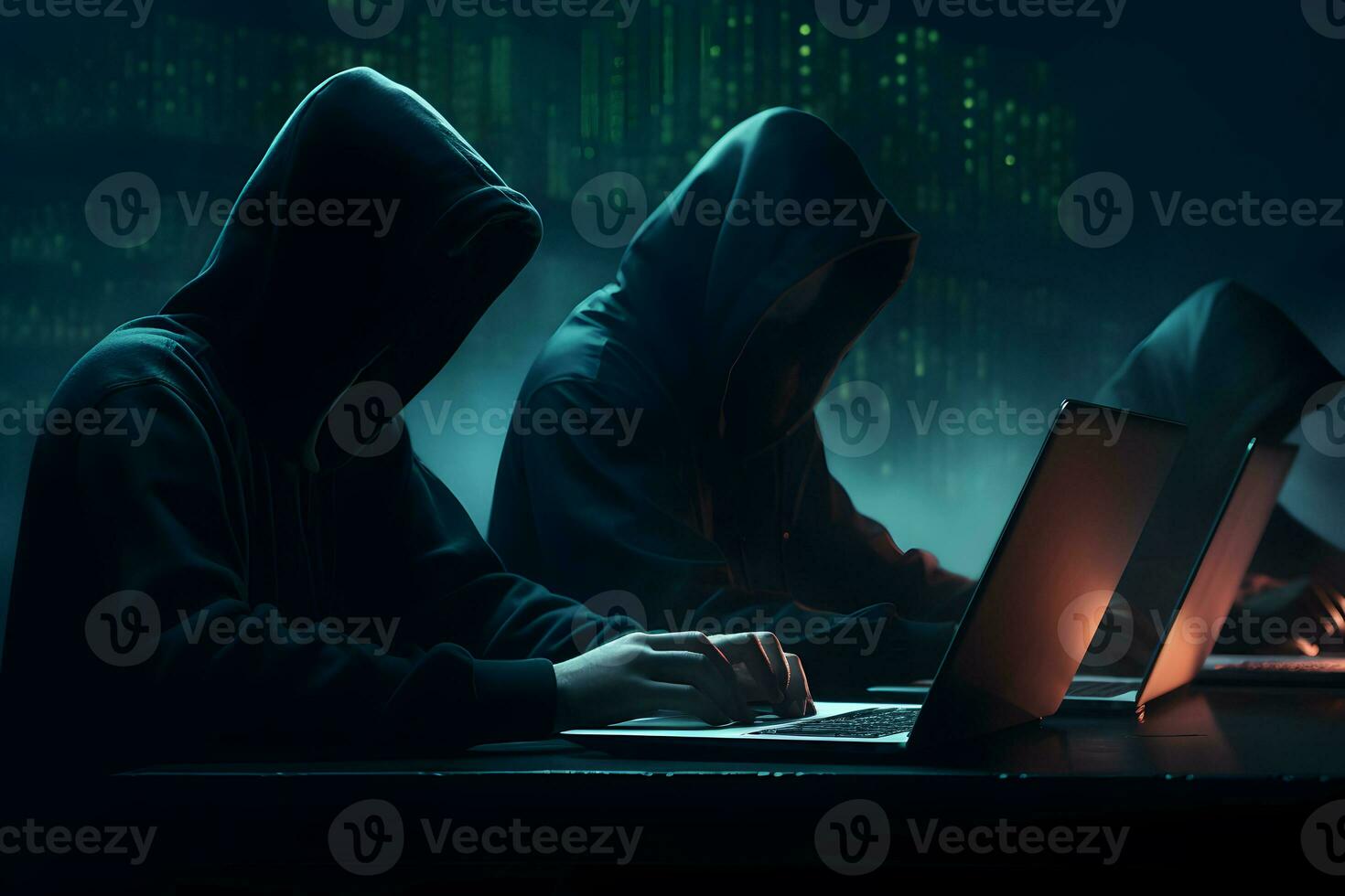 Hackers with hoodies typing laptops. Hacker group, organization or association. AI generated Pro Photo