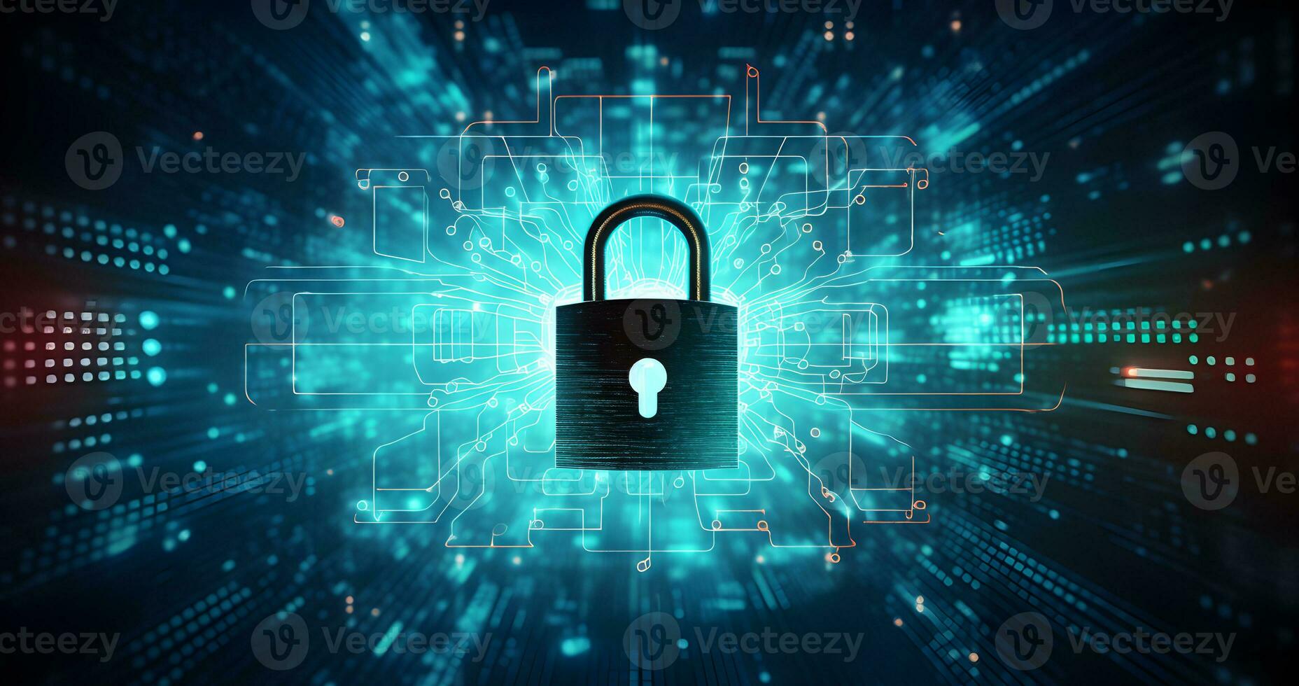Lock on circuit pattern. Concept of data security and cybersecurity Pro Photo