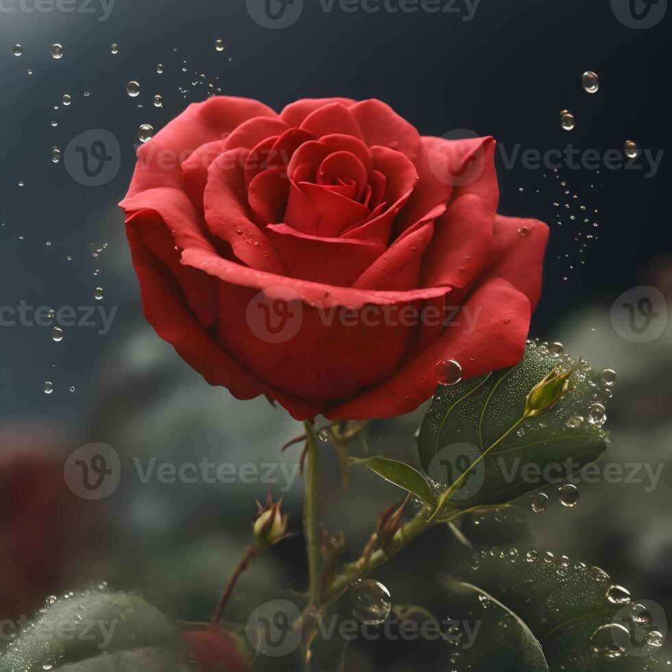 Create a digital art piece featuring a single red rose with dew drops on the petals Pro Photo