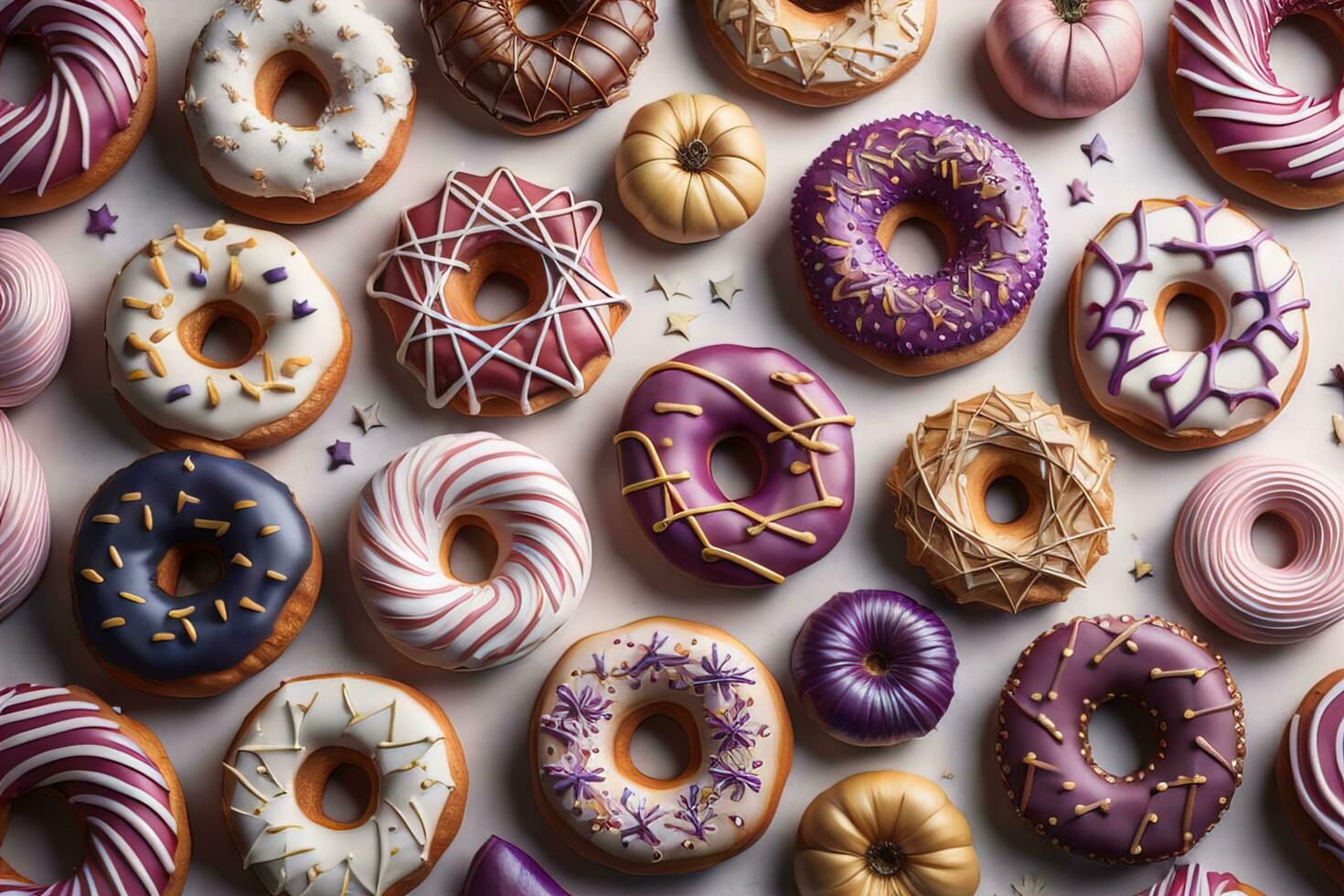 Variety of donuts on a solid color background. Top view. ai generative photo