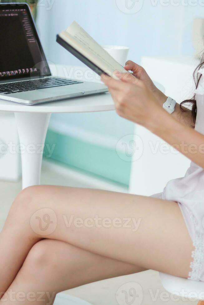 young woman wearing white see through pajamas sits and reads book to review lessons in morning to understand and learn lessons from books because exam time is near. concept of reading books to learn Pro Photo