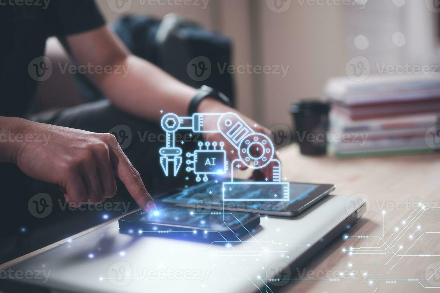 artificial intelligence Digital transformation change management, internet of things. man working on smartphone computer tablet and virtual diagram, smart industry.Ai tech Pro Photo