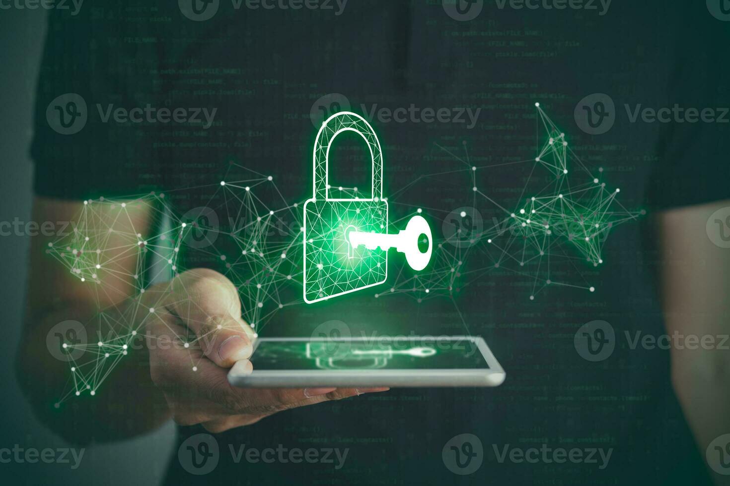 Business man using tablet with padlock and key icon screen, Data Security system concept, innovation technology, cloud computing, internet network communication Pro Photo