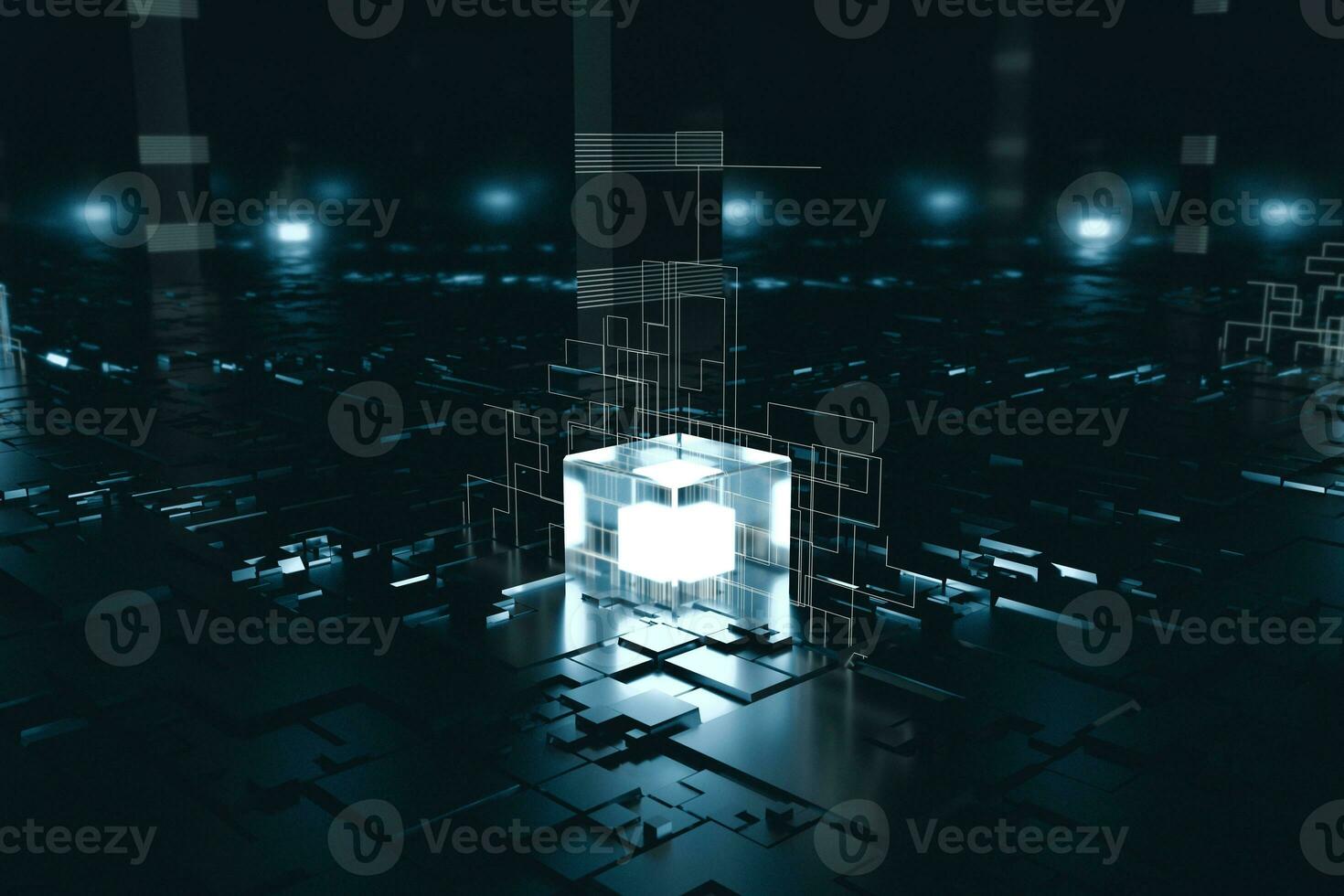 Glowing cubes with circuit lines with dark background, 3d rendering. Pro Photo