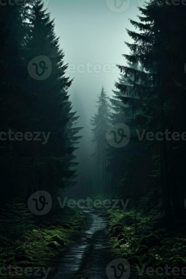 An eerie fog descends upon a dense forest creating a haunting atmosphere background with empty space for text Pro Photo