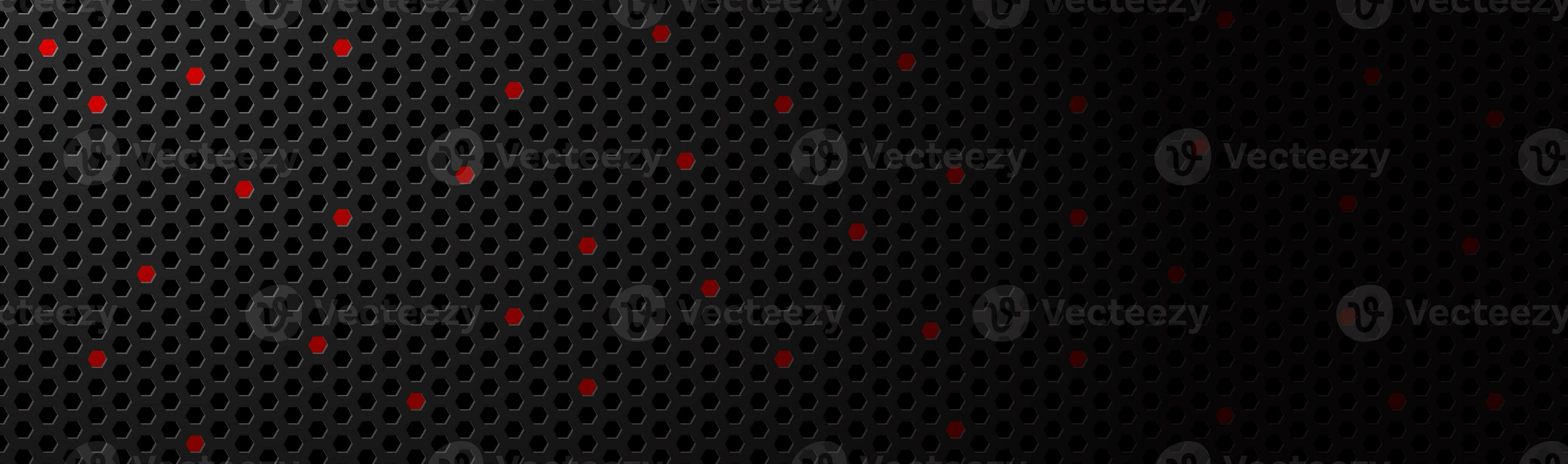 Abstract dark black geometric hexagonal mesh material header with red dots. Metallic technology banner with blank space for your logo. Vector abstract widescreen background Pro Photo