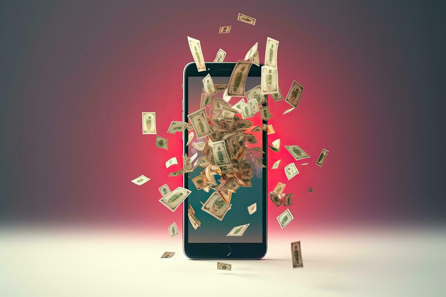 dollar money returning back from dark modern smartphone on light background,3D rendering,copy space,generative ai photo