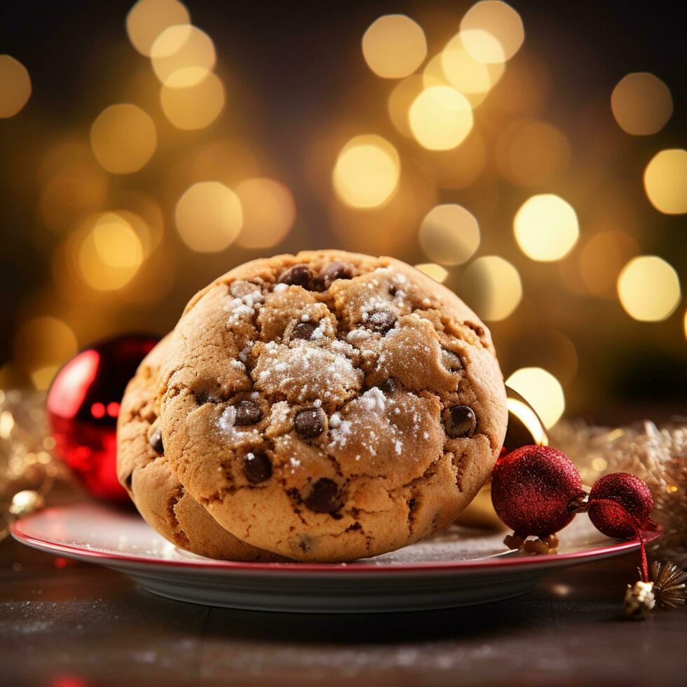 AI generative Chocolate chip cookies on a plate on a background of Christmas lights bokeh photo