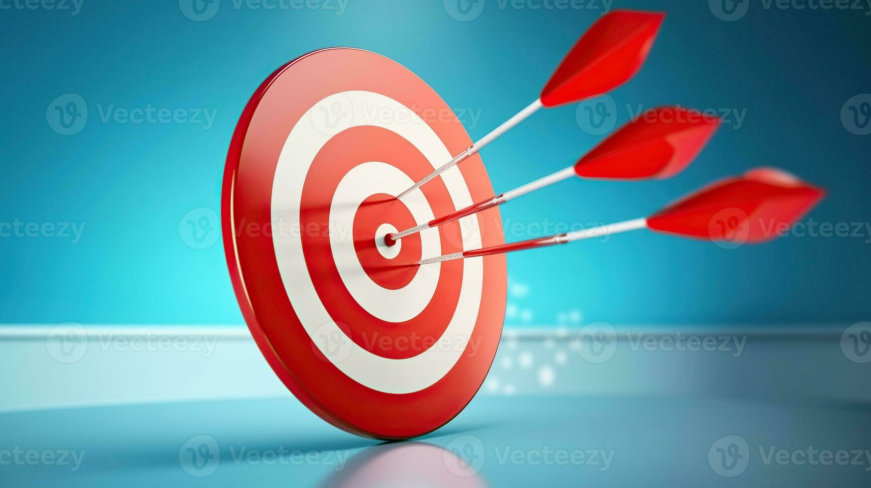 Creative illustration of red round shaped target with thin arrow representing concept of setting goals correctly on blue background, Generative AI Pro Photo
