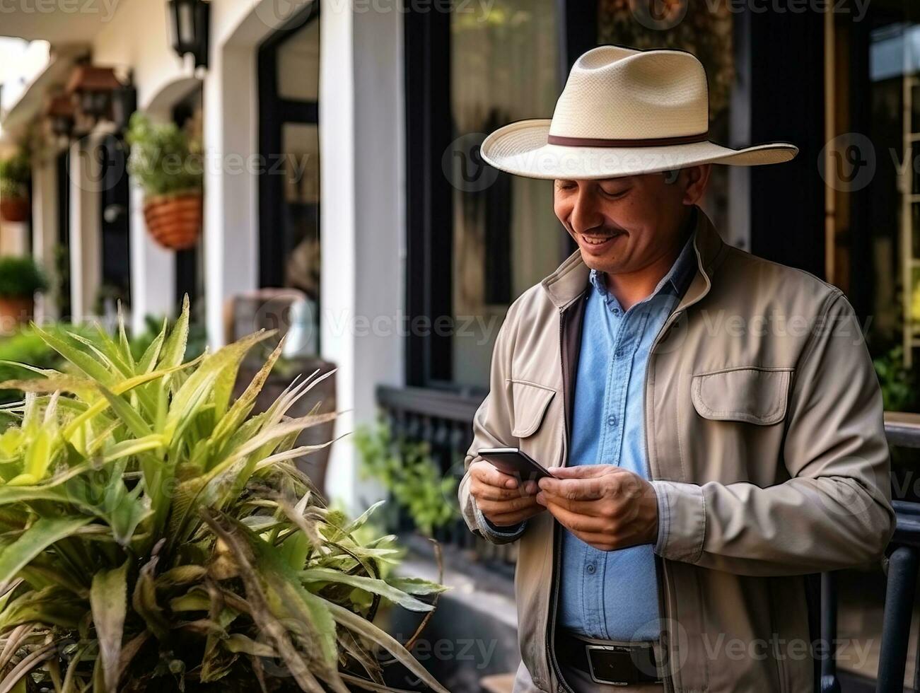 man from Colombia using smartphone for online communication AI Generative Pro Photo