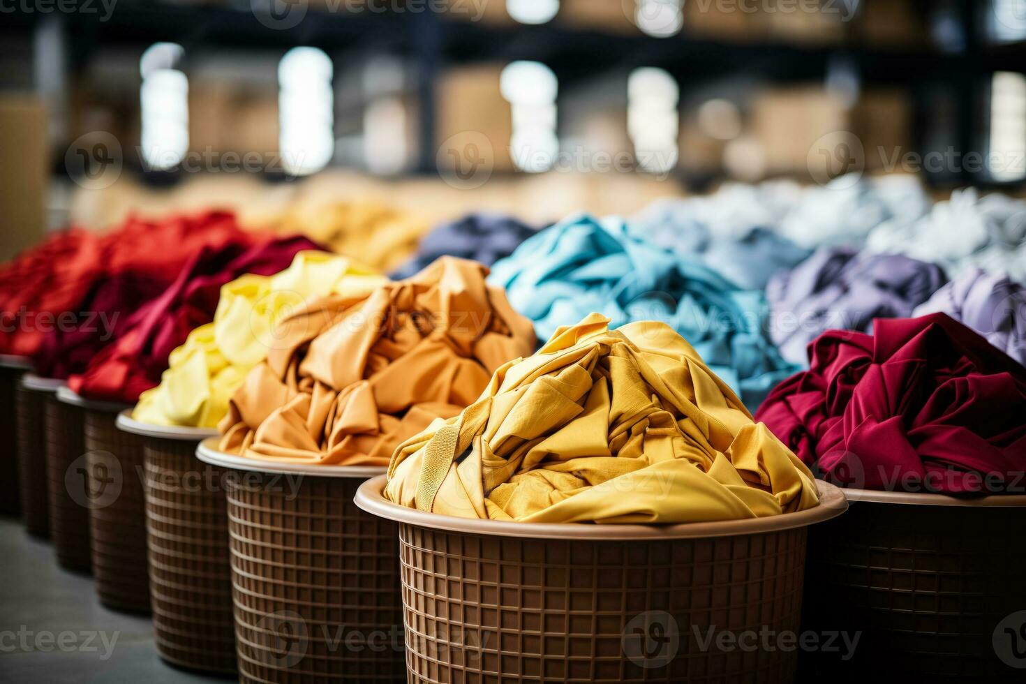 Recycled textile materials in large bins factory background with empty space for text Pro Photo