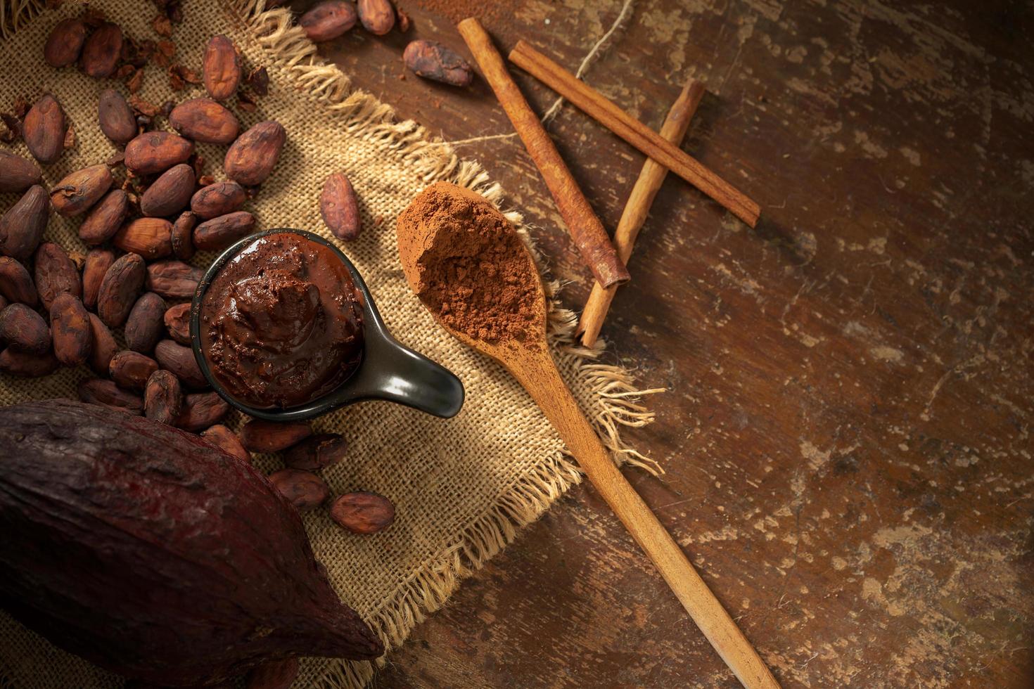 Cocoa pod beans and cocoa nibs setup on rustic wooden background Free Photo