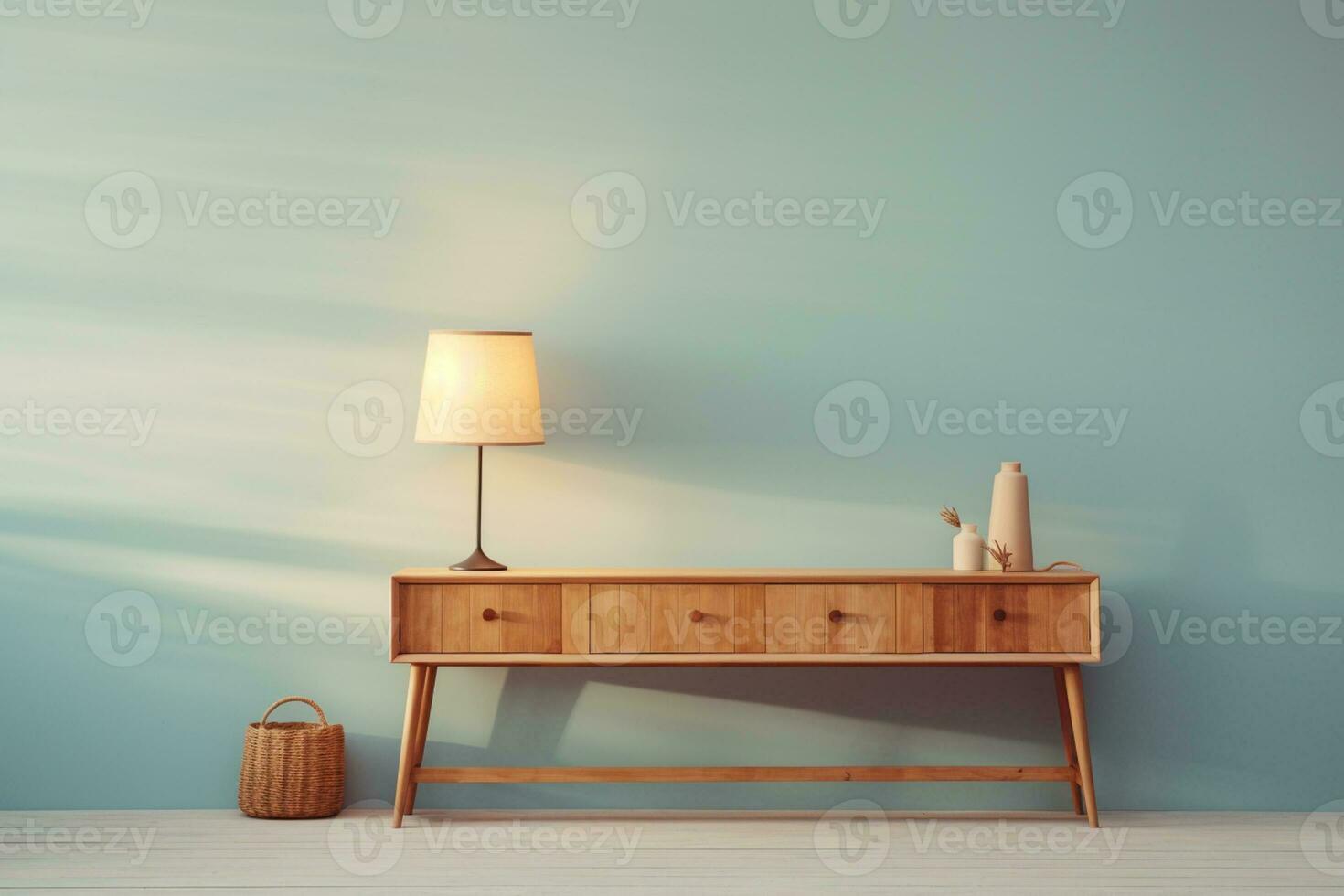 a wooden console table near a window in empty room with wallmounted Pro Photo