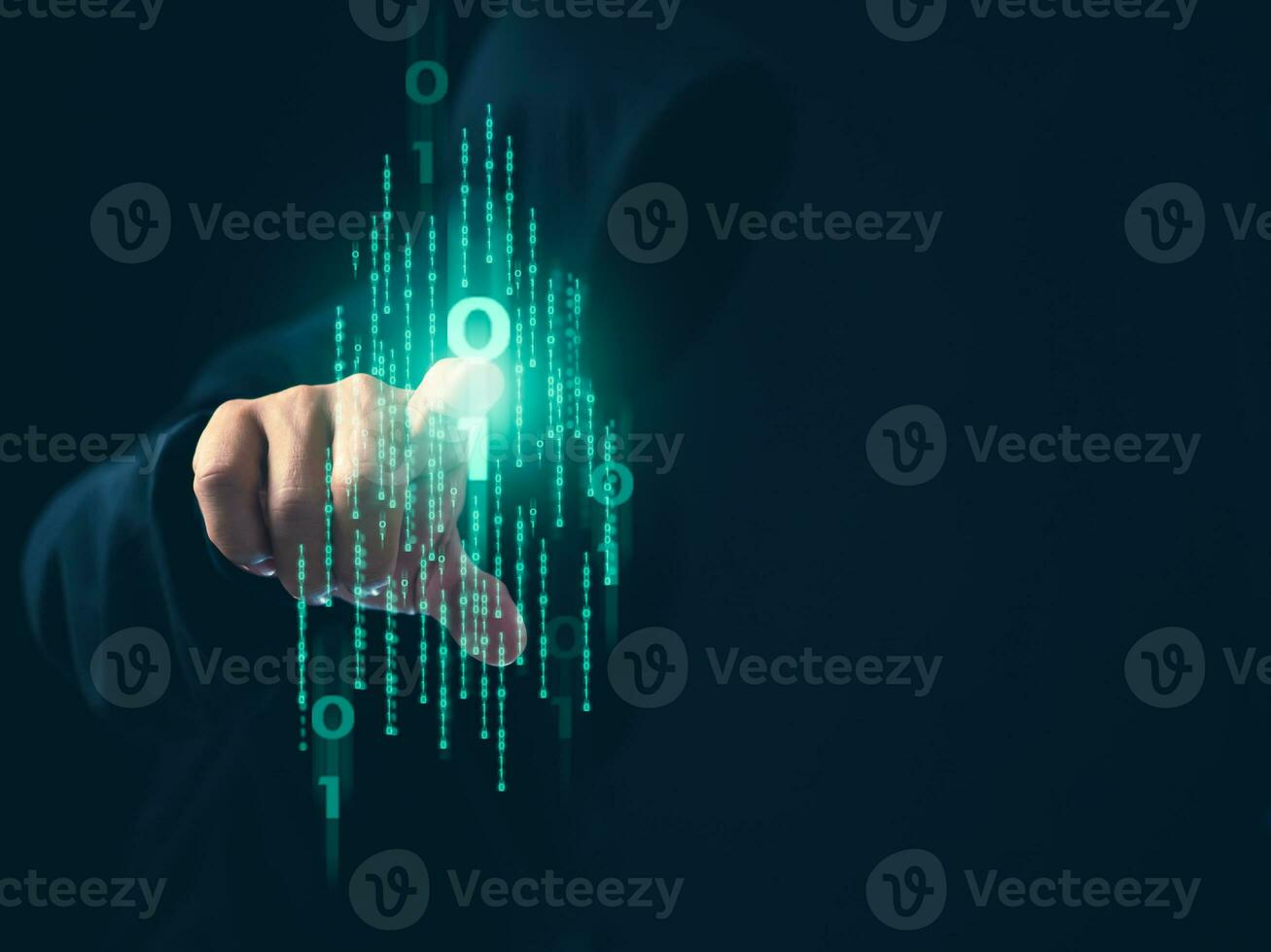 Hacker is pointing his finger at a group of zeros on a dark background. Concept of information security in internet networks and espionage. Pro Photo