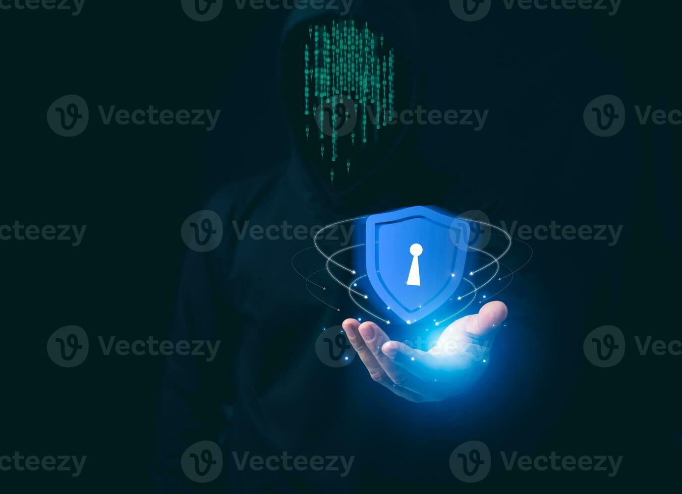 Hacker is holding a data protection sign on a dark background. Concept of information security in internet networks and espionage. Pro Photo