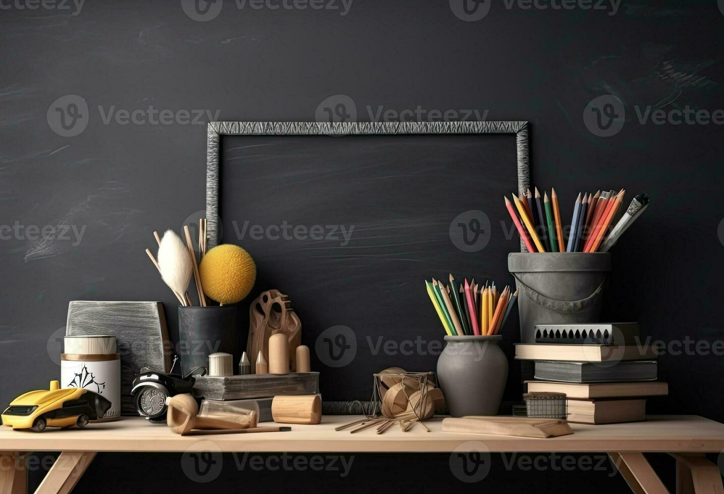 back to school concept with old schoolbooks, alarm clock and apple against a chalkboard background. Created with Generative AI technology. Pro Photo