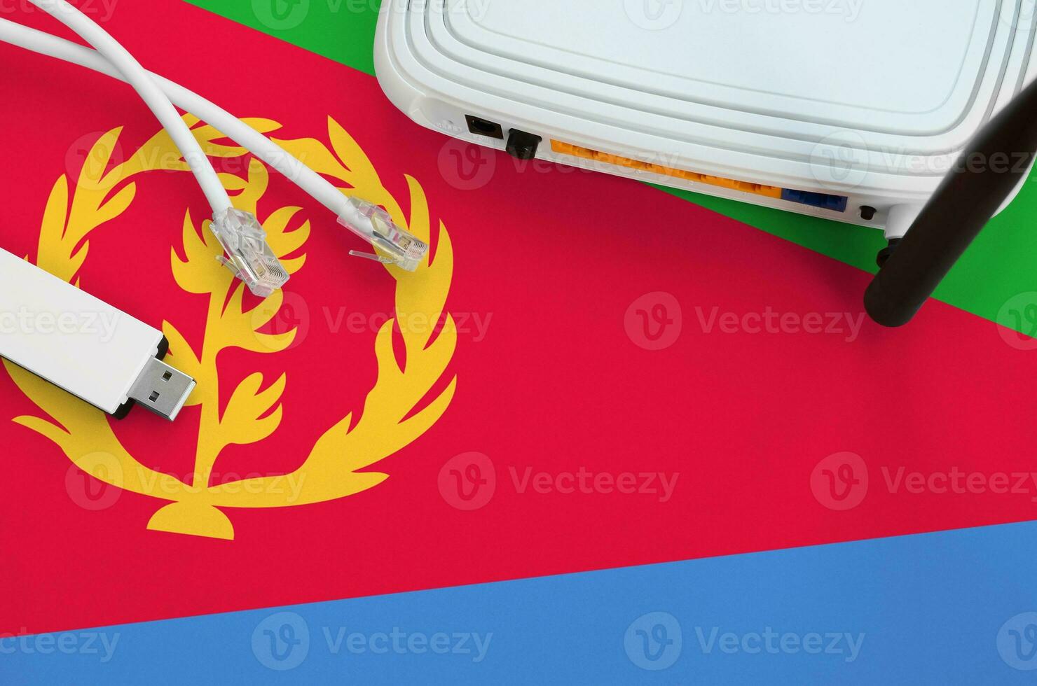 Eritrea flag depicted on table with internet rj45 cable, wireless usb wifi adapter and router. Internet connection concept Pro Photo