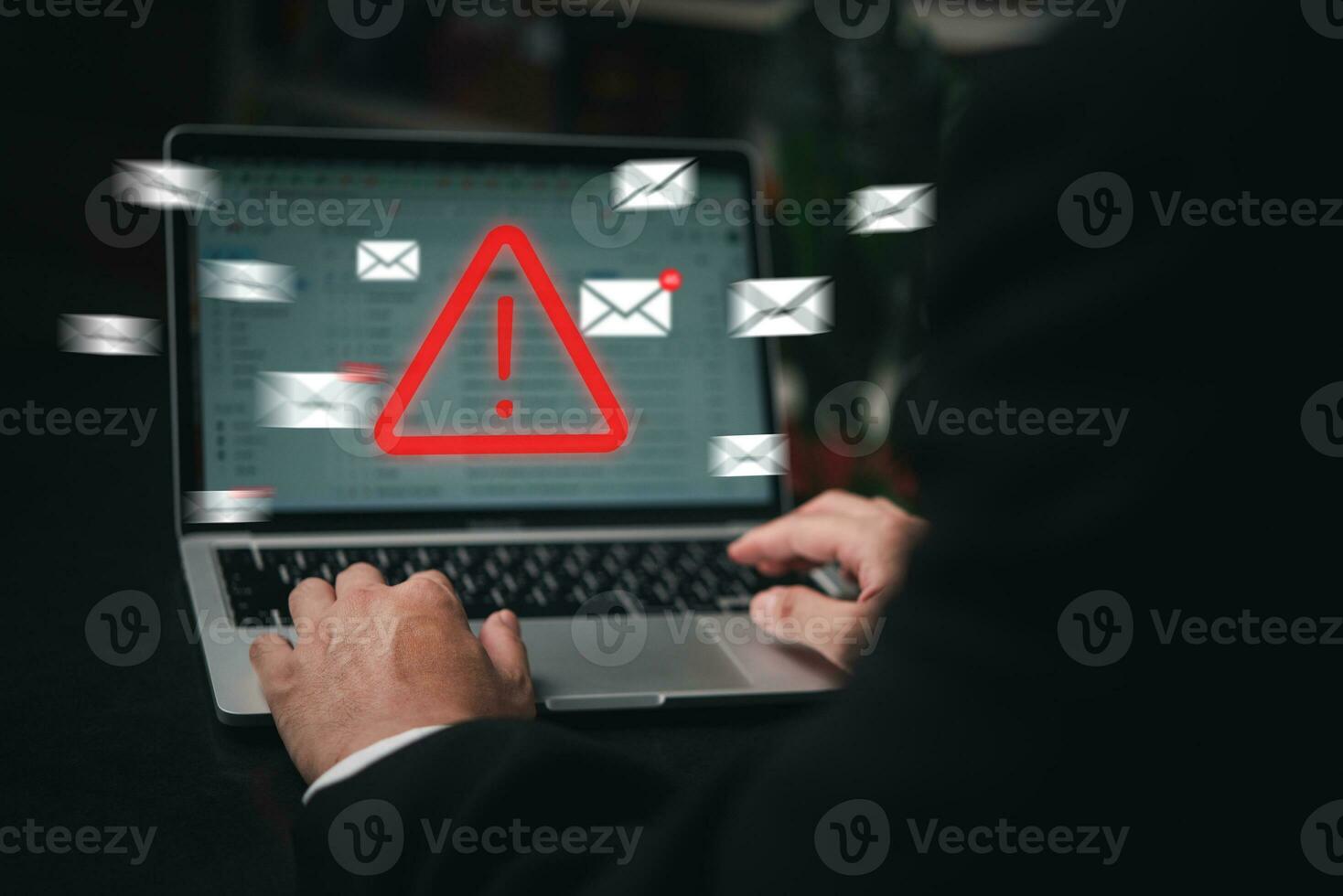 Man using laptop computer with hacker alarm protecting data from cybercrime in the digital age. Internet security and privacy defending against data theft and email breach. Pro Photo