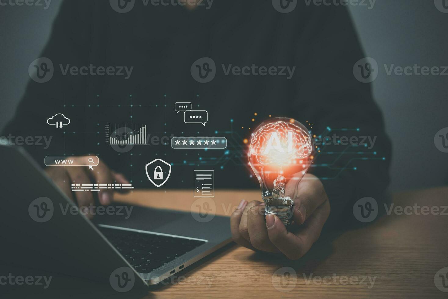Business hand holding light bulb icon of cloud computing, ai security password, web browsing finance communication technology network. Pro Photo